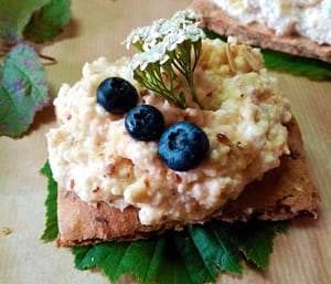 Vse sestavine zmešaj v gladko kremo in jo nadevaj na pripravljeno testo. Po okusu ga okrasi z borovnicami ali robidami, listi koprive ter postavi na lešnikov list. Ajdovska sladica je posebnega okusa in sladka.