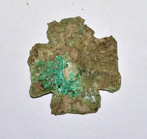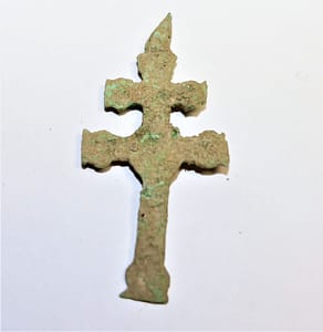 Med raztresenimi najdbami sta zanimiva tudi dva križca. Prvi križ enakih krakov, ki se širijo navzven (slika 7), je bil odkrit na nivoju raziskanih najvišje ležečih grobovih. Taki križi so pri nas datirani v 17. ali 18. stoletje. Vsi grobovi so bili prekriti s temno rjavo plastjo zemlje in peska, v kateri smo odkrili križ z dvema prečkama in tulipanskimi razširitvami na zaključkih, imenovan tudi karavaka križec. Taki križi so pri nas datirani v 17. in 18. stoletje.