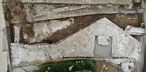 Slika 2: Izkopno polje s temelji severne stene ladje baročne cerkve, prečnimi zidovi, grobovi in ostanki jame z apnom na sredini (foto: Klemen Dremelj).