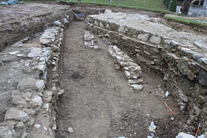 Slika 1: Na dnu izkopnega polja med novejšimi temelji in temelji baročne cerkve smo raziskali romanske in gotske temelje zidov. Pogled proti cesti Poljane–Javorje (foto: Mija Ogrin).