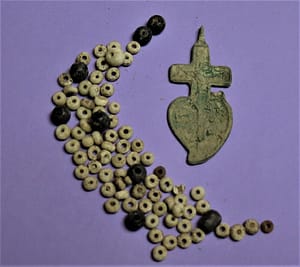 Prav tako so v grobove prilagali rožne vence. V grobu številka 138, v katerem je bil pokopan kar 198 centimetrov velik moški, je bil priložen rožni venec. Sestavljen je iz belih manjših in večjih črnih jagod, zaključeval pa se je s križem v kombinaciji s srcem (slika 6). Rožni venec in s tem tudi grob lahko datiramo v 17. ali 18. stoletje. Odkrili smo še nekaj rožnih vencev s črnimi jagodami.